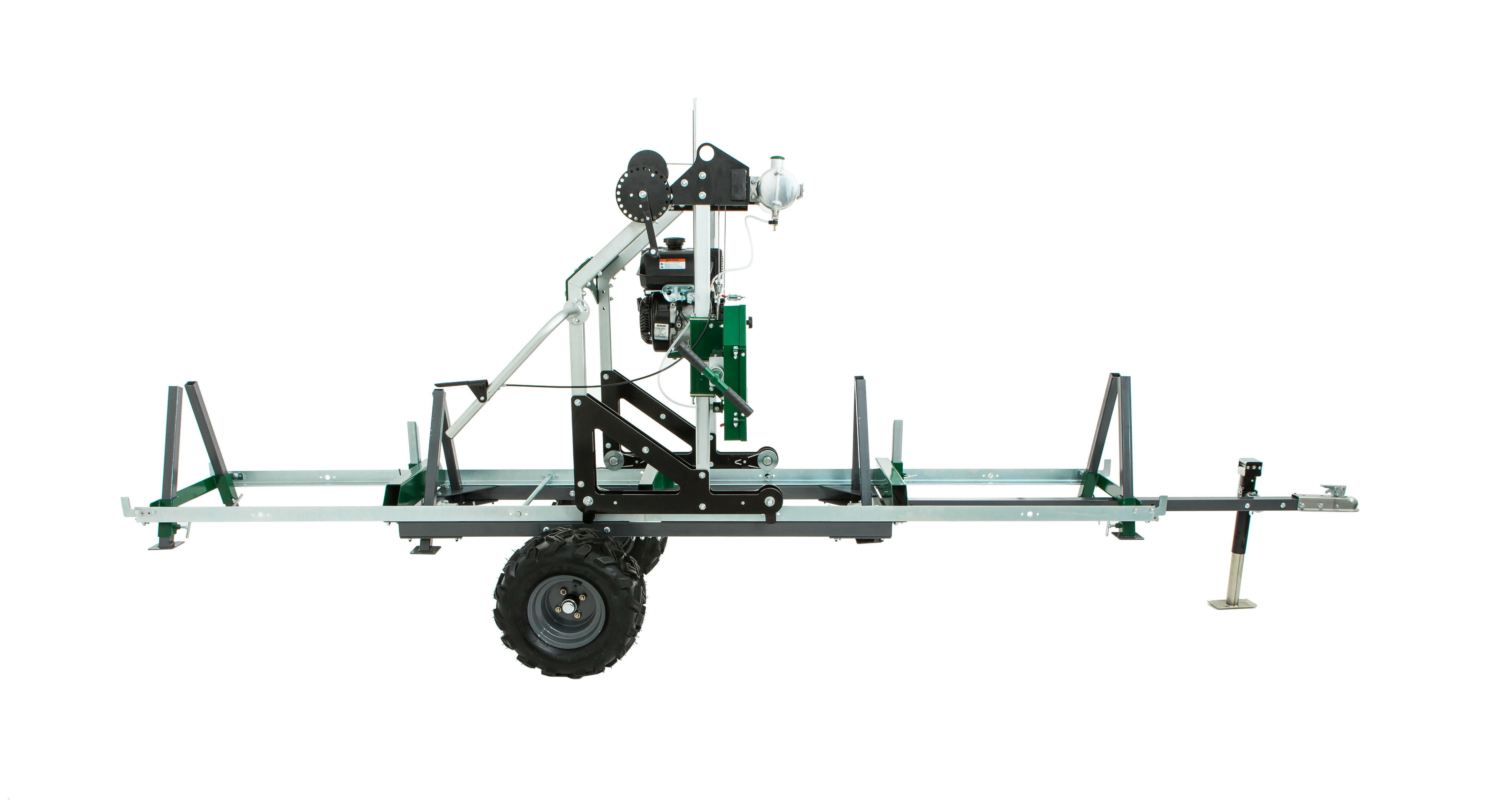 선택사양인 Bushlander 트레일러용 대형 통나무 적재 램프 및 윈치 키트 액세서리는 트레일러에 장착되어 최대 1,134kg(2,500lbs) 무게의 통나무를 제재소 베드에 쉽게 굴릴 수 있습니다. 이 키트에는 2개의 강철 경사로, 30'(9m) 합성 로프가 있는 수동 수동 크랭크 윈치, 윈치 포스트 및 사용하지 않거나 운송 중에 경사로를 트레일러에 고정하는 잠금 핀이 포함됩니다. 이 키트는 별도로 판매되며 Bushlander Standard/XL 트레일러와 호환됩니다..