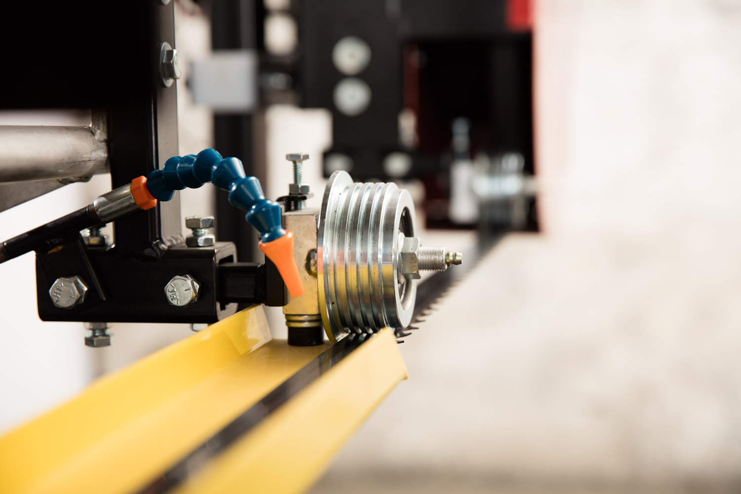 경쟁사 공장의 값비싼 업그레이드. 기름칠 가능한 3″ 블레이드 가이드 롤러 기름칠 가능한 베어링과 큰 직경은 블레이드와 베어링 수명을 크게 늘립니다.